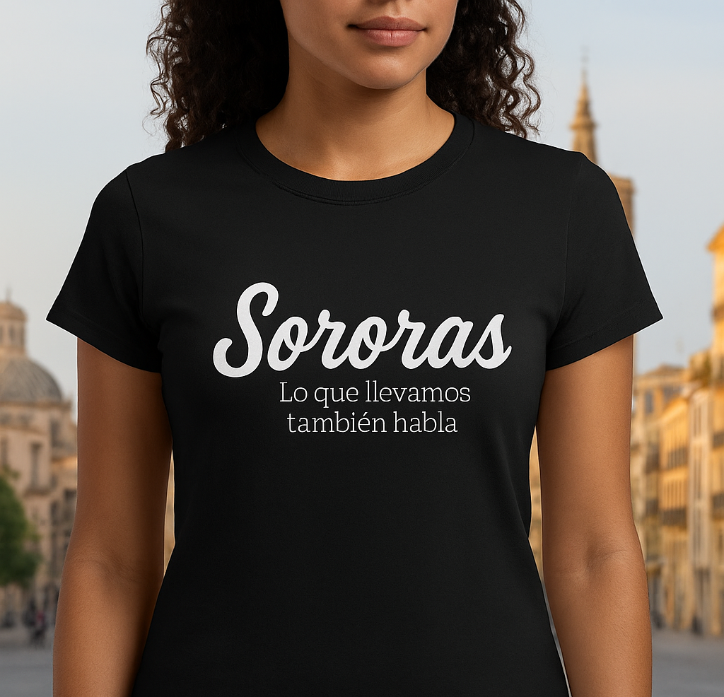 Camiseta Sororas de diseño exclusivo, disponible en diferentes tallas y en 3 colores. Confeccionada en algodón 100% reciclable, es una prenda ecológica, cómoda y resistente, pensada para vestir con estilo y conciencia. Además, parte de los recursos obtenidos con su venta se destinarán a apoyar a personas con discapacidad, convirtiéndola en una prenda con impacto social positivo.
